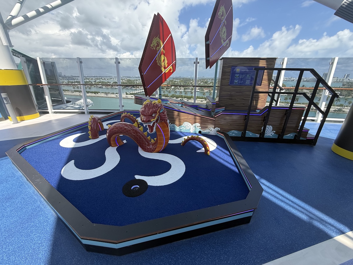 Lo que más llama la atención es el gran trabajo realizado para el entretenimiento familiar, en las áreas de los decks superiores. Allí encontrarán el nuevo Moon Climber, un laberinto de puentes colgadizos de varios niveles, perfectos para toda la familia (claro que nos subimos e hicimos buen ejercicio, nos encanta probar todas las atracciones). Es una actividad gratuita, que hicieron en el espacio dentro de la chimenea del barco (muy buena idea, por cierto). También el Luna Midway, que en este barco tiene una reimaginada gran área de mini golf. El “Tee Time”, es una experiencia inmersiva, que ocupa dos niveles y que en el Luna está dedicado a varios países como México, China, Inglaterra e Italia. Es otra experiencia espectacular para toda la familia, y tiene un costo de $5. No te pierdas esta divertida actividad que puedes hacer de día y de noche (la iluminación es espectacular).