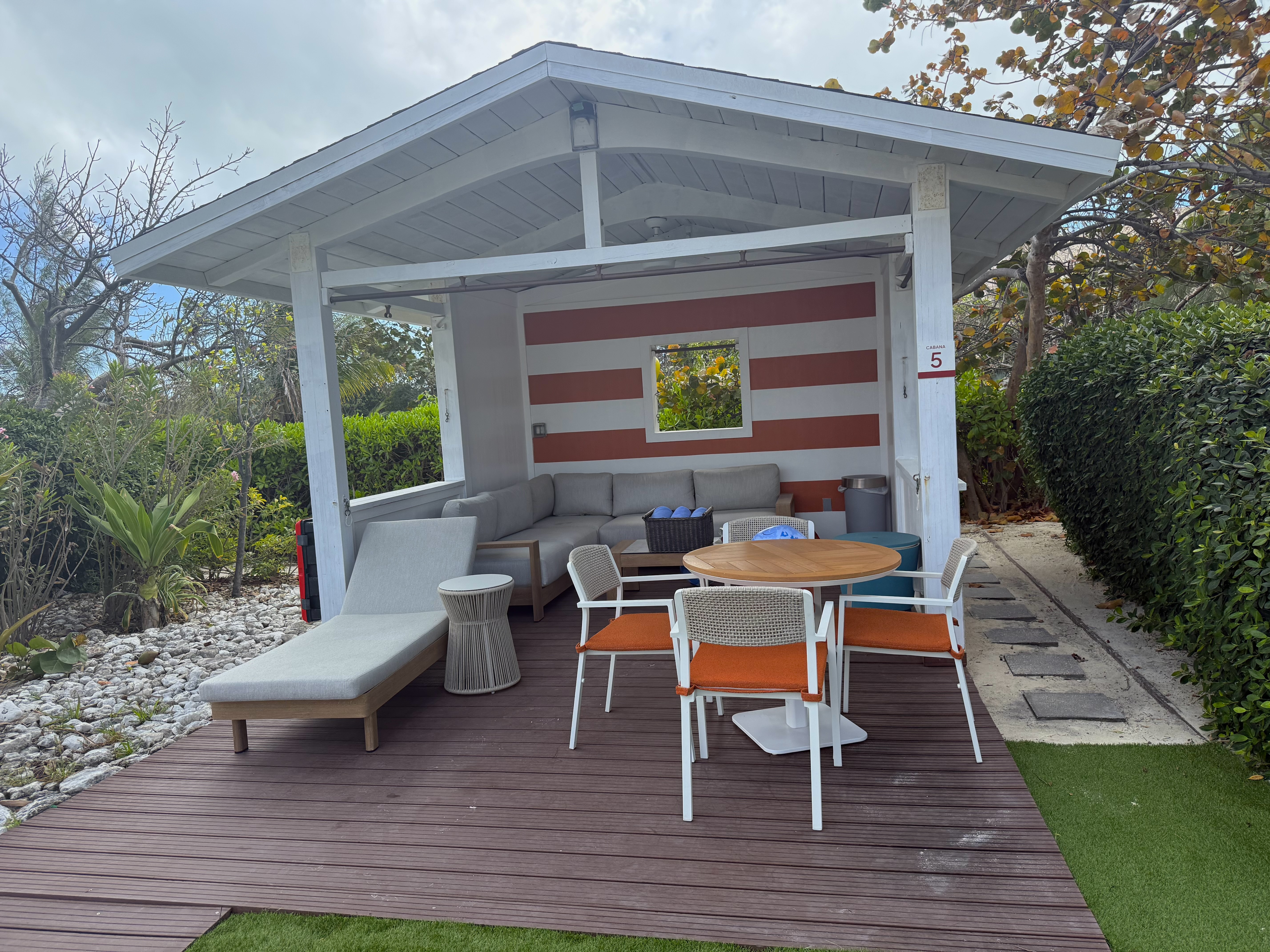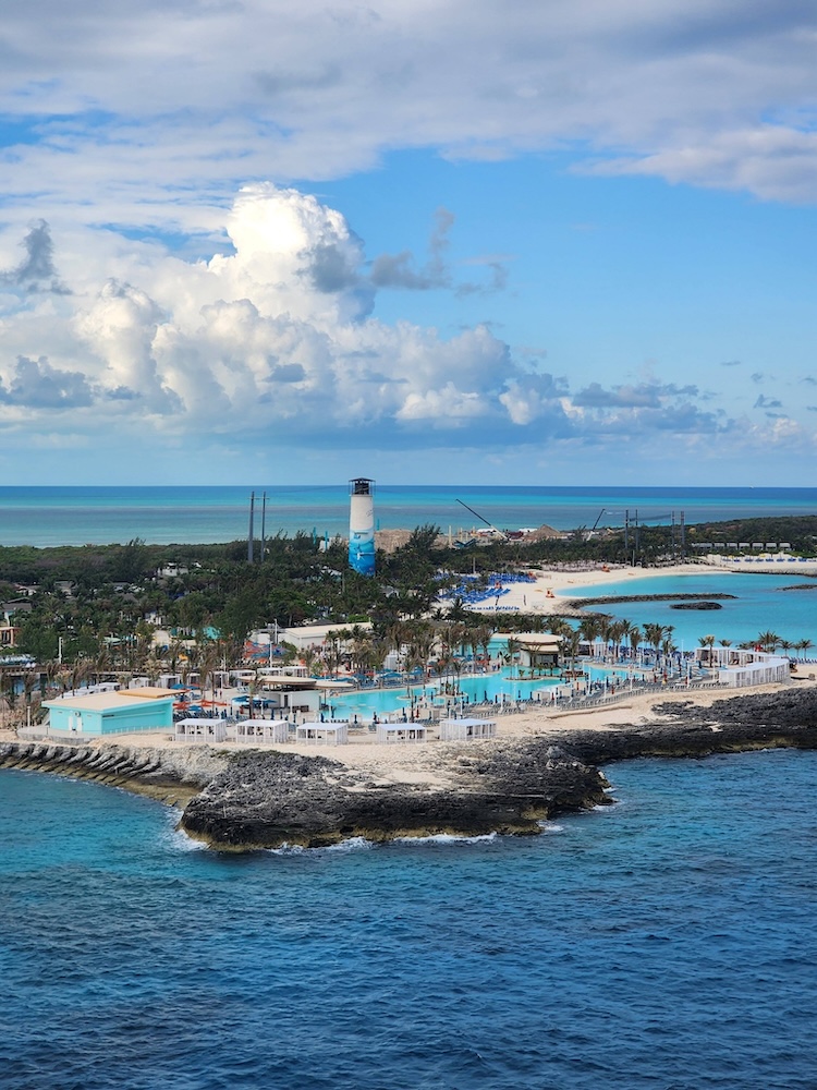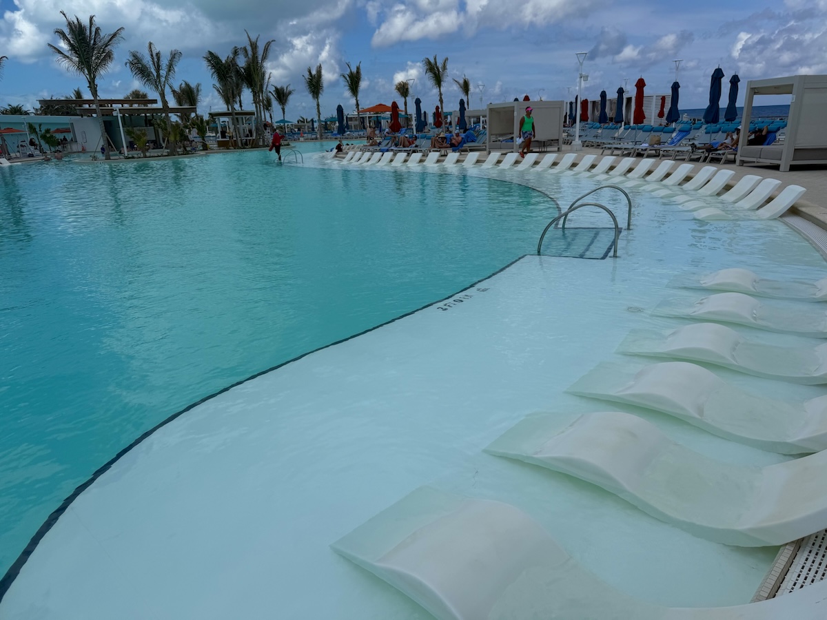 Muy cerca está Great Life Lagoon. Nos impresionó grandemente esta enorme piscina con agua climatizada, de 28,000 pies cuadrados. Allí hay dos bares tipo “swin-up” para que disfrutes tus bebidas sin tener que salir del agua, otros bares alrededor con bebidas tipo frozen y otras opciones, numerosas sillas y sombrillas para taparte del sol (sin costo adicional), y preciosas vistas al mar, incluyendo al barco. También hay cabañas para alquilar, si deseas más privacidad y trato personalizado. Si quieres ejercitarte, desde allí puedes ir caminando al muelle, a través de un puente panorámico.